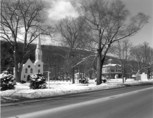The Pine Meadow Historic District , situated in the Farmington Valley in the northeast corner of the Town of New Hartford, encompasses the historic nineteenth century village of Pine Meadow. Since natural barriers left little room for expansion or modern development, Pine Meadow appears much as it did in the late nineteenth century. From the historic maps of 1874 and 1878 it is apparent that less than a dozen historic houses have been lost, with a number on the east side of the district due to periodic flooding of the river. Except for a group of modern houses and the 1951 Pine Meadow School built on Wicket Street (outside the district), most of the remaining open land was in a floodplain and never developed. Some changes are related to the industrial development and decline of the village. For example, all that is left of the railroad that once ran along the base of the hills on the west is the abandoned track bed that terminates in a brownstone abutment for a bridge that once crossed Main Street on the north, before continuing across the river to New Hartford Center. The railroad depots at either end of the district also are gone. Of the two other historic bridges that once spanned the Farmington River, one was a covered wooden bridge at the east end of Black Bridge Road; its replacement is now closed. The other, which once provided direct access to the factory complex at the southeast corner of the village, is no longer extant. Chapin Park, which is slightly more than an acre in size, occupies an elongated triangle near the center of the Pine Meadow Historic District between Main Street on the east and Church Street on the west. Although today its mature trees, a few possibly survivors of the original plantings, are randomly distributed, the park was originally landscaped more formally with regular rows of trees, especially along its bordering streets. There is a flagpole and a World War II memorial at its north corner. [NR]
