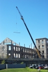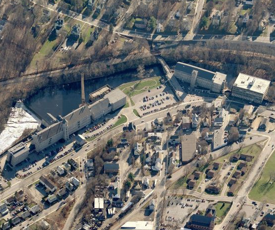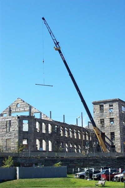 see National Register nomination http://www.nps.gov/nr/feature/places/pdfs/14000434.pdf 1857 Mill No. 1, 3 1/2-story, 200' x 68' with dormered gable roof and central stair tower, has coursed ashlar walls of granite blocks quarried from the banks of the adjacent Willimantic River. The 1864-65 gable-roofed Mill No. 2, 4 1/2-story and 400' X 70', has random-coursed granite walls, central stair tower and three round windows in each gable end. An ell extending back to the river held the wheelhouse, machine and carpenter shops. The 1-story stone office dates from 1865. In 1870 Willimantic Linen built the Dye House and Bleachery, 2 1/2-story with random-coursed stone walls and gable roof, west of Mill No.2, and the 4-story Inspection Building, with similar walls and a near-flat roof, to the east. Mill No. 3 (not extant) was a frame cotton mill bought by the company in 1882. Mill No.4, built in 1884, was designed specifically to be lit electrically. The extremely wide brick mill (1-story and 820' x 174') gained some illumination from its sawtooth monitor roof, but overhead arc-lamps were the primary source of light. In order to obtain maximum unobstructed light from both the monitors and the lamps, all shafting ran in tunnels beneath the floor. Willimantic Linen began Mill No.5 in 1895; the 4-story brick-pier mill has a flat roof, segmental-arch lintels and stone sills. American Thread built the 5-story, flat-roofed brick-pier Mill No.6 in 1907 and the similar (but 3-story) new dye house in 1910. The last structure in the complex, a 5-story reinforced concrete storehouse, was built c.1915. There are many related structures extant: the 2 1/2-story, randomcoursed stone barn; the 3-story, frame company store; four masonry dams; the 1869 stone-arch bridge over the river; and some 70 workers' dwellings, most of which are 1 1/2-story, gable-roofed, frame houses with single or double entry. (Roth)