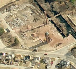 In 1861-62 Williams Grosvenor, a Providence physician, built the 5-story brick mill (about 200' x 60) several hundred yards downstream from the earlier Masonville complex. It was one of the first mills designed by F. P. Sheldon and Son, the noted firm of industrial architects/engineers from Providence. The near-flat roof, the segmentally arched lintels, and the aggressive upthrust of the pyramidal-roofed central stair tower were features that became standard for southern New England textile mills in the last third of the 19th century. The mill has been altered with a steel and glass addition on its east facade. Nineteenth-century additions include a 4-story brick mill attached to the west side and a I-story brick weave shed to the south. Associated housing includes a frame boardinghouse and nine frame, double-entry dwellings. (Roth)