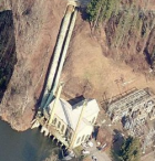 Bulls Bridge dam, a curved gravity, masonry structure about 25' high, 22' wide at the base and 195' long, stands about two miles upstream from the power house. The company built a second dam (Spooner dam) in the bypass channel, cut by the river, which carries spring flood water around a rocky knoll; Spooner dam is 19' high, 14' wide at the base and 125' long. The canal runs through rock, earth and along hillsides. In rock it is a simple cut; in earth the sloping walls are faced with riprap; rolled-earth embankments with riprap facing support the canal on hills. The canal feeds into a steel penstock which carries the water the last 420' to the power house. Two steel surge tanks (8' diameter, 96' high; 5'diameter, 98' high) tower over the steel-framed, concrete power house (112' x 45' with a 45' x 45' ell), where six turbine-generator units operate under 105' head. The turbines, all S. Morgan Smith Co. model F-1's with double .35 in. horizontal runners, are original to the installation, Five of the General Electric generators are original and one is a replacement. (Roth)