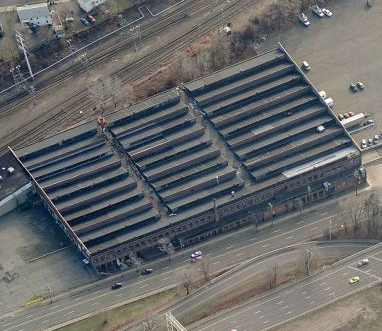 The Connecticut Company’s former State Street streetcar barn is comprised of three primary adjoining blocks located on the south side of State Street, at the southeast corner of State Street’s intersection with James Street. The two original blocks were erected ca. 1920 and are of brick pier construction. The main block is a two-story, 250’ x 450’ red brick trolley barn with full-height window bays topped by corbelled brick headers, rectangular window openings, concrete window sills, tile coping, and a flat roof with 27 sawtooth monitors. The front and rear (west and east) elevations have stepped brick parapets, with only one story of the east (rear) elevation rising above ground level due to the slope of the site. Numerous trolley bays with roll-up doors can be found on both the east and west elevations. Some of these have been retained while others have been infilled or converted into window walls. A continuous course of attic-story windows extends along the roofline of the building’s north elevation facing State Street.