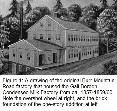 Gail Borden Jr. (1801-1874) devised a technique for condensing liquids, especially milk, which would allow for transportation and storage without spoilage. He patented the process in 1856. He tried to produce condensed milk commercially, and after several failed attempts, he moved into the building on Burr Mountain Road, which had been built by Milo Burr in 1854. By 1859 Borden was processing some 2,000 gallons of milk a day into condensed milk. In 1860, with the help of a financial partner, he relocated the factory to Winsted and added a second in Wassaic, New York, near the railroad. After Borden, John M. Burr used the factory as a woolen mill from 1874 to 1877, when the building burned.