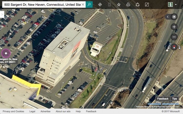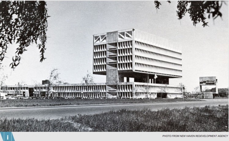 A four story office tower floats on cantilevered trusses two stories above the three story base, designed as research and warehouse space. see State Register nomination: http://newhavenmodern.org/system/dragonfly/production/2014/01/16/5yl3lsp3d9_SRN_NewHaven_Sargent_500.pdf