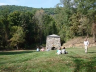Stuart, Hopson and Co. built the first blast furnace here in 1826. It was 28' high, charcoal-fired and used cold blast. The ore, a hematite yielding 60% iron, was dug from a mountainside in South Kent; charcoal and lime were also produced locally. In 1864, with additional investors, Kent Iron Co. was formed and a slightly larger, hot blast furnace replaced the earlier stack. Charcoal supply was a problem by this time, as the 1864 furnace was fired by a mixture of charcoal and anthracite. Kent Iron Co. rebuilt the stack to its present dimensions in 1870. Its battered walls, made of rough granite blocks in random ashlar, were 32' high in 1870, but erosion and vandalism have destroyed the upper 8'. Iron tie-rods reinforced against expansion. Arched openings break three of the walls, with the 14'-high hearth opening on the south side. Inside, bosh diameter is 9'; two layers of fire brick are partially intact and a great deal of brick and other debris has accumulated at the bottom of the furnace. None of the blast system remains except for a vague depression that was once the power canal which carried water from the dam (across the Housatonic River) to the wheelhouse, where a breast wheel drove the blowing tub. The sheds that stored charging materials are gone, as are the frame structures that surrounded the operating furnace: the charging house atop the stack and casting house below. Foundations are all that remain of the saw and grist mills run by the iron company. Depletion of local charcoal and surface ore at South Kent caused the operation to slow to a halt in 1892.