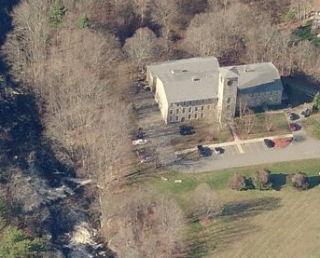 The Kirby Mill was originally constructed as a textile Mill in 1882. It was only used for textile production for a short time and was then purchased and operated by George Kirby for the purpose of manufacturing gold jewelry, eyeglasses and eyeglass accessories. (courtesy The Kirby Mill website) A group of local investors, headed by Marcus Johnson, built this mill in 1882 at a water privilege on the Natchaug River which previously had been occupied by another silk mill and several smaller shops. The mill took skein thread from mills in Massachusetts and Rhode Island and finished it by twisting, doubling, braiding, washing and bleaching. American Thread Co. bought the mill in 1899 and soon moved the machinery to its factories in Willimantic. A hardware firm used the mill until after World War II, when the University of Connecticut acquired the property. The race and wheelpit have been bulldozed, the basement windows filled with cinder blocks, and ancillary wooden sheds removed. (Roth)