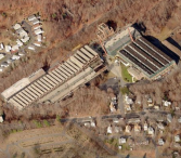 General Motors’ former New Departure Division Forge Plant is comprised of roughly nine mixed freestanding and adjoining primary blocks forming a sprawling complex located on the north side of Terryville Avenue at the northern terminus of Franklin Street. The plant was built in five phases, these completed in 1922, ca.1925, ca. 1934, 1942, and ca. 1950. The 1922 buildings are located on the western half of the site and include a forge shop, machine shop, bar storage building, and garage. The machine shop is a one-story red brick building with large window openings and steel frame sash. The structure originally measured 268’ x 74’, yet was lengthened to 516’ ca. 1925, and then 608’ ca. 1950. The building has a flat roof, this topped by a single clerestory monitor extending the full length of the structure. The forge shop is located directly north of the machine shop and is a one-story steel-frame building with brick curtain walls framing large window openings with steel frame sash. It originally measured 130’ x 398’, yet was lengthened to 611’ ca. 1925, and then 810’ ca. 1934. The building has a flat roof, this topped by 25 parallel rows of clerestory monitors. The bar storage building is a one-story steel-frame structure with corrugated metal sheathing and a side-gabled roof situated directly north of the forge shop. The bar storage building originally measured 256’ x 74’, but was lengthened to 396’ ca. 1925. The next primary addition to the Forge Plant came ca. 1925 when a new powerplant was built for the factory. This is located roughly 200’ northeast of the aforementioned forge shop and is a one- and two-story red brick structure with prominent brick piers framing large window openings. The powerplant measures approximately 120’ x 54’ overall. It has a flat roof topped by a brick parapet and concrete coping. The final additions to the Forge Plant are located directly south of the powerplant. It consists of three primary blocks, an office, machine shop, and annealing building, all built in 1942. The office is a two-story, 104’ x 60’ red brick block dominated by wide ribbon windows on each floor. The building’s primary entrance is centered on its west elevation and the roof is flat. The office’s east elevation abuts the two-story, 250’ x 362’ machine shop. The building has a steel frame with brick apron walls on its first floor and steel and glass sheathing above. The block’s flat roof is dominated by five eight-foot tall clerestory monitors, these glazed with turquoise-colored glass or fiberglass panels like the rest of the building’s fenestration. The annealing building abuts the northern elevation of the machine shop and is a three-story, 104’ x 300’ steel-frame block with brick apron walls on its first floor and steel and glass cladding above. Ribbon windows extend across the full-width of all of the building’s elevations and a clerestory monitor extends the full length of the roof. All of the fenestration is glazed with turquoise-colored glass or fiberglass panels.