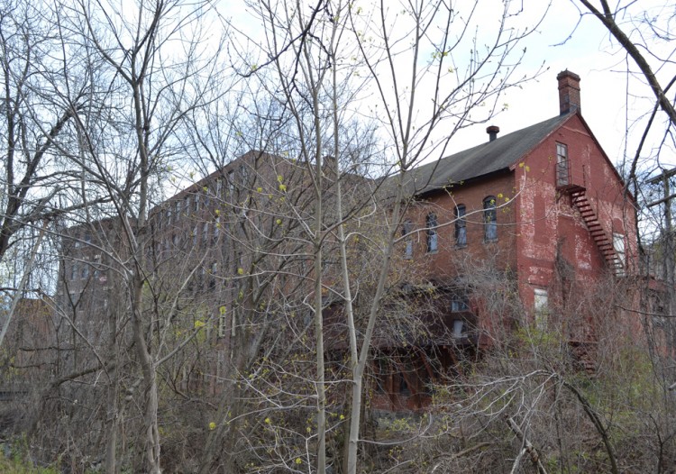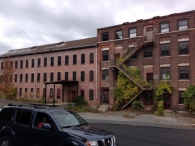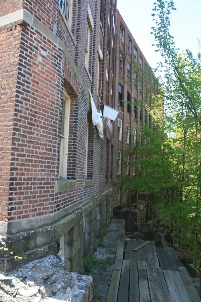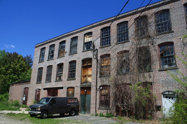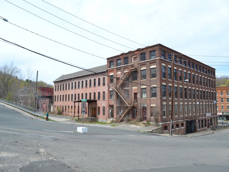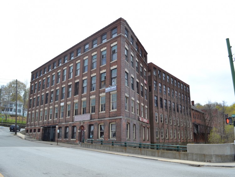 The former New England Pin Company mill consists of roughly five adjoining primary blocks located on the west side of Bridge Street, at the northwest corner of Bridge Street’s intersection with Prospect Street and along the south bank of the Mad River. The plant’s most prominent block fronts on Bridge Street and was erected in 1901. It originally housed offices on the first floor and a machine shop and paper box manufacturing on the upper levels. The red brick building measures 116’ x 45’ and stands five stories tall. It has a heavy ashlar stone foundation, brick pier walls, stone watertables delineating the first and second and fourth and fifth floors, a corbelled and denticulated brick cornice at the fourth floor level, red brick corbelling along the roofline cornice, tile coping, and a flat roof. The first floor window openings have flat-arched brick lintels, heavy stone stills, and a mix of one-over-one and six-over-six double-hung wood sash. The second-, third-, and fourth-floor window openings are rectangular and have splayed stone lintels, stone sills, and either six-over-two or six-over-six double-hung wood sash. The fifth floor has short segmental-arched window openings unified by arcaded brick headers and the stone watertable. The fenestration consists of one-over-one double-hung wood sash. A three-story, 28’ x 112’ red brick block adjoins the southern end of the office/manufacturing building’s west (rear) elevation. The ell was originally erected as a two-story block ca. 1880, yet was raised to its present height in 1902. The building housed packing, shipping, and pin sticking operations, and has a rough-cut stone foundation, segmental-arched window openings with brownstone sills and brick lintels, six-over-six double-hung wood sash, and a front-facing gable roof. A two-story, 23’ x 62’ red brick and wood-frame block adjoins the west elevation of the packing/shipping/pin sticking building. This was erected for storage use ca. 1895. It has a rough-cut stone foundation, rectangular window openings with six-over-six double-hung wood sash, and a flat roof. A three-story, 42’ x 100’ red brick block adjoins the northern end of the office/manufacturing building’s west (rear) elevation. This was built in 1905 to house both pin and paper box production. The building has a heavy ashlar stone foundation; brick pier walls; rectangular window openings with stone sills, brick lintels, and two-over-two-over-two triple-hung wood windows; tile coping, and a flat roof. A three-story, 40’ x 80’ red brick block adjoins the 1905 block’s west elevation. The former was built by the New England Pin Company ca. 1880, yet was occupied by the New England Knitting Company from 1887 to 1955. The building has a rough-cut stone foundation, segmental-arched window openings with stone sills and brick lintels, one-over-one double-hung windows, and an overhanging front-facing gable roof.