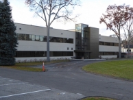 The building is comprised of a single block built in 1939 enclosing about 164,000 square feet. The overall footprint measures 242’ x 520’ in plan, massed to suggest a two story production loft in the front (east portion) and one story production shed at the rear. The main entrance is through a three story tower centered on the east elevation. The tower is asymmetrically massed as two engaged vertical rectilinear blocks of different height. The south tower block was originally built of glass block, divided at the height of the first story by a cantilevered concrete slab sheltering the main entrance below. The glass block was recently replaced by a plate glass curtain wall. The north tower block was originally faced with square precast concrete panels arranged as a regular grid. The north block and adjacent cantilevered slab are now faced with bronze-colored metal panels arranged in a bands of varying widths. Elsewhere, the exterior was mostly glazed with tall steel ribbon sash that turned all corners except for the northwest. On the first floor of the north elevation, the ribbon sash is broken by original side entrances. Elsewhere, the sash is continuous except for the projecting tower at front and projecting loading docks at the north end of the west elevation. The second floor of the east portion is arranged as a courtyard surrounding three roof monitors that lighted and vented production and shipping rooms below. The second floor area housed the administrative offices, a laboratory and lunchroom, and the walls were continuously glazed on their interior elevations overlooking the monitors. The west portion, a large warehouse for raw storage, was lighted by two additional large monitors. The outer elevations have been modified by replacement sash, continuous but shorter in height than the original sash, and the brick spandrels have been re-surfaced with composite panels of greater width.