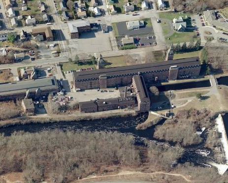 In 1865 Edward Taft of Providence began the cotton-textile manufacturing village that would bear his name. He bought 600 acres of land and a previously undeveloped water privilege (30' head) on the Shetucket River above Norwich. Construction of the mills, power system and village took five years. F. P. Sheldon and Son designed the brick-pier main mill. Ponemah first produced fine cottons such as percales, lawns and cambrics. English tradesmen and experienced Rhode Islanders filled many of the skilled and supervisory positions, while Irish comprised a majority of the initial 1,000-member workforce. After a strike in 1875, caused in part by the workers' demand for an adjustment in piece rates to correspond with the coarser goods being introduced, many people left the village for good. The turnover from Irish to French-Canadian millhands began at this time. In 1884 the company built Mill #2 for its weaving operations. In 1902 the weaving was again moved to a new building. Last in the line of mill structures is the 3-story brick storage building, started in 1900 and enlarged several times to its present size. The residential component of the village was enlarged around 1895 with 32 brick dwellings built south of the mills. These houses do not reflect growth in the number of people working in the mills, for even though the number of spindles increased from 108,000 in 1882 to 120,000 in 1890 and 265,000 in 1924, employment remained at about 1,500 from the 1880s. The new dwellings became necessary only after state laws prohibited child labor in the mills, thus requiring more families to provide the same number of millhands. The increase in number of spindles was achieved almost entirely through the adoption of new machinery and by increasing the number of machines each worker tended. After financial reverses in the 1930s the houses were sold. The mills were sold one at a time until 1970, when the last looms ran. (Roth)