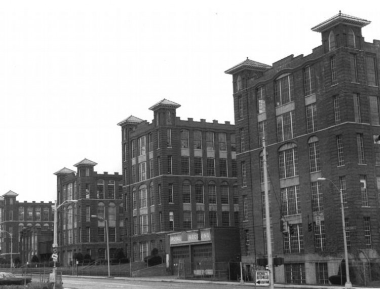 For description see National Register application: http://pdfhost.focus.nps.gov/docs/NRHP/Text/84003898.pdf The Royal factory consists of five parallel brick-pier wings, 4-story and 5-story, each about 240' long and ranging in width from 45' to 60'. The two eastern wings went up in 1907, and the others followed in 1917 and 1920. Overall the wings repeat the same exterior characteristics, with hip-roofed towers at the corners of the facades and crenelated battlements concealing near-flat roofs. Window treatments vary slightly among the wings, with some set in multi-story recessed panels and others simply set in the walls. The side windows of the 1920 wing, the furthest west, feature flat lintels with steel shelf angles, while segmental arches form the lintels in the other wings. (Roth)