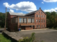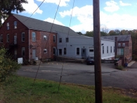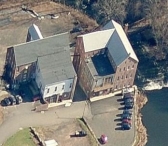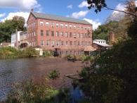 For description see National Register nomination: http://pdfhost.focus.nps.gov/docs/NRHP/Text/93001379.pdf All that remains of Starr's 1813 mill is the brownstone foundation, upon which Russell erected a new brick mill in 1865. The 3 1/2-story mill is 81' x 33' with a 40' x 40' ell. A 30'-wide arched headrace opening, now sealed shut, remains in the west wall of the foundation and there are three tailrace openings in the south wall. The masonry dam, about 13' high, was rebuilt by Russell, which also installed a Leffel turbine (date unknown) that remains in place just below the dam and outside of the 1813 foundation. Russell built the adjacent gable-roofed brick mill, 4 1/2-story and 85' x 40' with central stair tower, in the late 1860s. Both mills feature segmental arch lintels and wood sills. Four frame tenements built by Russell stand on a small hill just north of the mill pond. Russell occupied the mills until the late 1940s. Industrial tenants use them today. About 60' downstream from the dam the one-lane entry road crosses the river on a steel, rivet-connected pony truss bridge built by Berlin Construction Co. in 1927. (Roth)