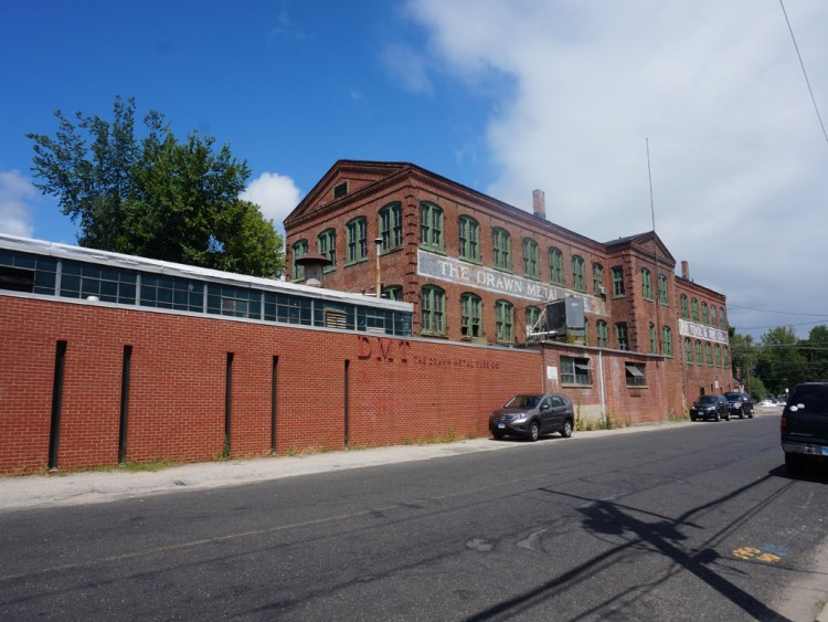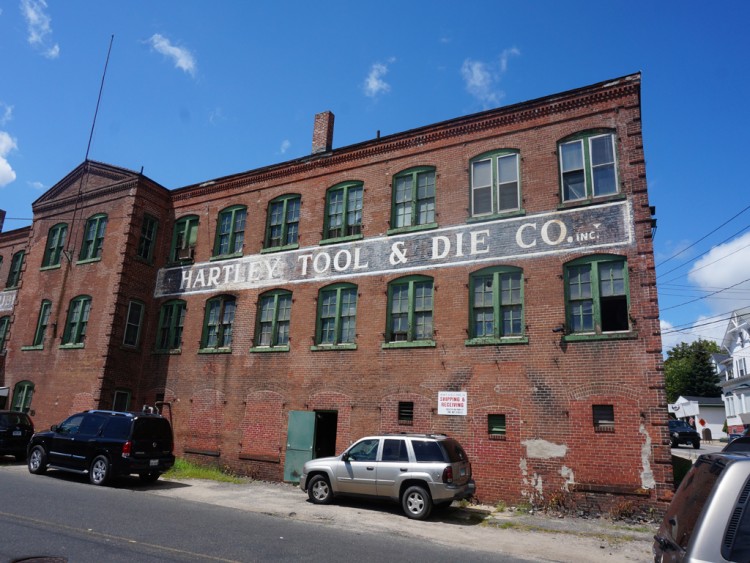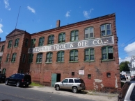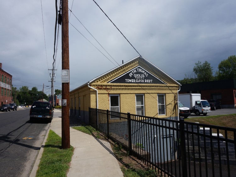 The Seth Thomas Clock Company of Thomaston developed from a long tradition of clock-making in the Naugatuck River Valley. Seth Thomas (1785-1859) apprenticed with one of the most famous clock makers of his day, Eli Terry (for whom Terryville, Connecticut is named). In 1807 Terry hired Thomas to make parts for wooden clocks, and together with Silas Hoadley, the three made clocks in Plymouth, Connecticut, under the name Terry, Thomas, and Hoadley. Thomas and Hoadley bought out Terry in 1809. Thomas then sold his interest to Hoadley in 1813 to start his own shop in Plymouth Hollow (renamed Thomaston after his death), which he incorporated in 1853. By the 1880s, the Seth Thomas Clock Company comprised three factory locations: the case shop on South Main Street, the marine shop on Marine Street (demolished), and the movement shop on Elm Street. In the 1930s, Seth Thomas Clock was purchased by the General Time Corporation, a conglomerate that bought many clock-making companies throughout the Naugatuck Valley. The movement shop was developed in the 1860s in a former cotton mill to which additions were made. The bulk of the movement shop was located on the south side of Elm Street on the west bank of the Naugatuck River, and, with the exception of a few small storage buildings, has since been demolished (possibly in the 1955 flood). What remains, at the southwest corner of East Main Street and Elm Street, is a building that was used for storage, dial painting and assembly. By 1940, the surviving movement shop structure was occupied by the Hartley Tool and Die Company (now operating at 135 South Main Street in the Seth Thomas case factory). Hartley Tool and Die Co. makes carbide crush rolls, cemented carbide dies and bushings; the president in 1956 was Earle W. Hartley Jr. The building is now occupied by the Drawn Metal Tube Company (established in 1937).