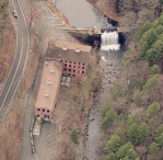 Meyer and Poppenhusen built a rubber mill here in the early 1850s. All that remains of their mill are the rubble-walled wheelpit and foundation with arched tailrace openings. New York Belting and Packing Co., occupants of the next downstream mill privilege, bought this site in the late 1860s and built a new mill on the old foundations. New York Belting and Packing revamped the water power system, rebuilding the dam and replacing the overshot waterwheel with a Rodney Hunt double-runner horizontal turbine. After U. S. Rubber bought New York Belting and Packing in 1900 the upper factory was used as a reclaiming plant to reprocess used rubber products. Thor Plastics Corp. bought the factory in 1928 and for over 30 years made a variety of plastic products, including Parcheesi games and bakelite electrical components. A recent owner has built a concrete retaining wall for the dam and plans to generate electricity with the turbine, which is now being restored. (Roth)
