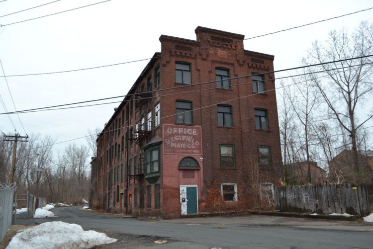 The former Westfield Plate Company plant is comprised of two adjoining blocks located on the east side of North River Street, west side of the Hartford-Springfield rail line, and approximately 300 feet north of Main Street. The four-story mill was erected in 1893 and is of typical brick mill construction yet shows a high degree of detailing on its façade (south elevation). The building’s main block measures 35’ x 139’ and has a three-story, 35’ x 33’ red brick block abutting its north elevation. The façade is divided into three bays by full-height brick piers, these rising to a corbelled and crenellated brick cornice and a highly detailed brick parapet. The latter has a raised central bay featuring a terracotta plaque that reads ‘1893’. The mill’s primary entry is located on the west side of the south elevation and consists of a round-arched opening with a multi-pane transom. Above this there is a faded sign that reads ‘OFFICE/WESTFIELD/PLATE CO./CASKET HARDWARE and DRY GOODS’, over which later lettering reads ‘INTERNATIONAL CASKET HARDWARE CO.” Fenestration throughout the building is set in segmental-arched openings and has brick sills. The building retains a number of its original wood windows, these primarily consisting of paired six-light casement sash with a pair of two-light transoms above. A number of the windows have modern replacements or have been boarded up. A three-sided bay window with a hipped roof is located at the southern end of the west elevation. This has double-hung one-over-one wood sash. The building’s side elevations have full-height window bays delineated on each floor by recessed brick spandrels that rise to corbelled sills below each window. The red brick walls rise to a corbelled brick cornice that extends along the flat roofs. Faded lettering running along the roofline of the east elevation (that facing the rail line) reads ‘WESTFIELD PLATE CO. CASKET HARDWARE AND DRY GOODS’.