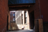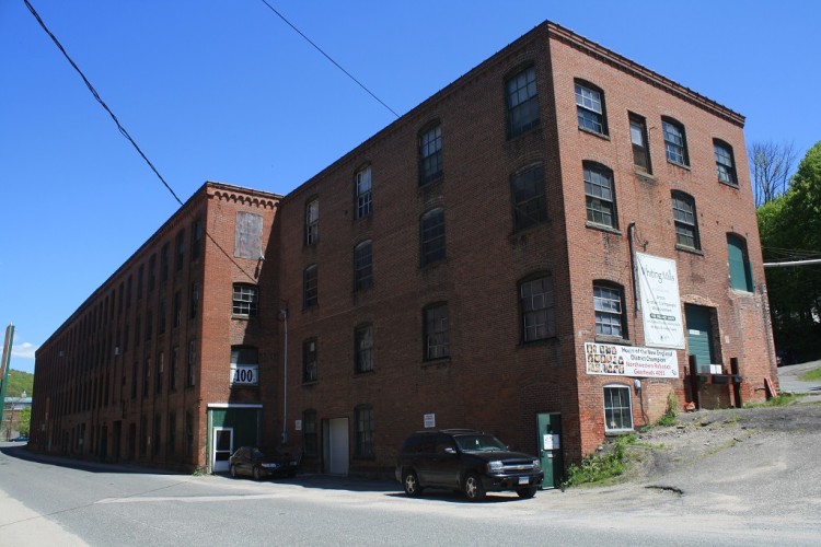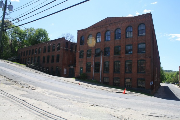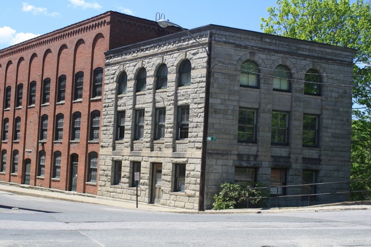 For description see National Register application: http://pdfhost.focus.nps.gov/docs/NRHP/Text/85000308.pdf The west mill, about 300' x 60', has segmental-arched lintels, stone sills, and corbeled drops and arches at the cornice. The east mill, about 275' x 60', has similar features. Attached to the east mill is a 3-story, 50' x 39' office block, built in 1905 of granite blocks in random ashlar. (Roth)